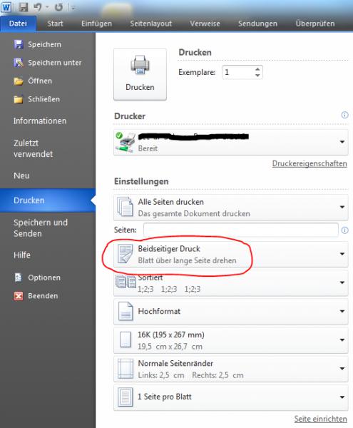 Office: Druck-Standard festelegen/beidseitig drucken/WORD 2010