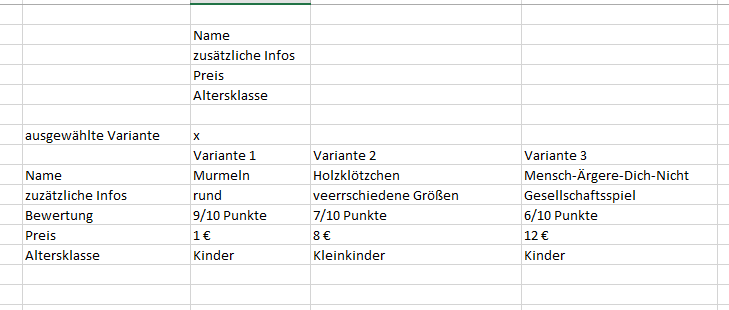 Helfe beim Thema Informationen von ausgewählten Variante übertragen in Microsoft Excel Hilfe um das Problem gemeinsam zu lösen; Hallo zusammen, folgendes Problem kann ich nicht lösen: Ich habe beispielsweise mehrere Varianten zur Auswahl, die ich manuell eingebe in Excel. Am... Dieses Thema im Forum "Microsoft Excel Hilfe" wurde erstellt von Laura_Wind, 14. November 2022.