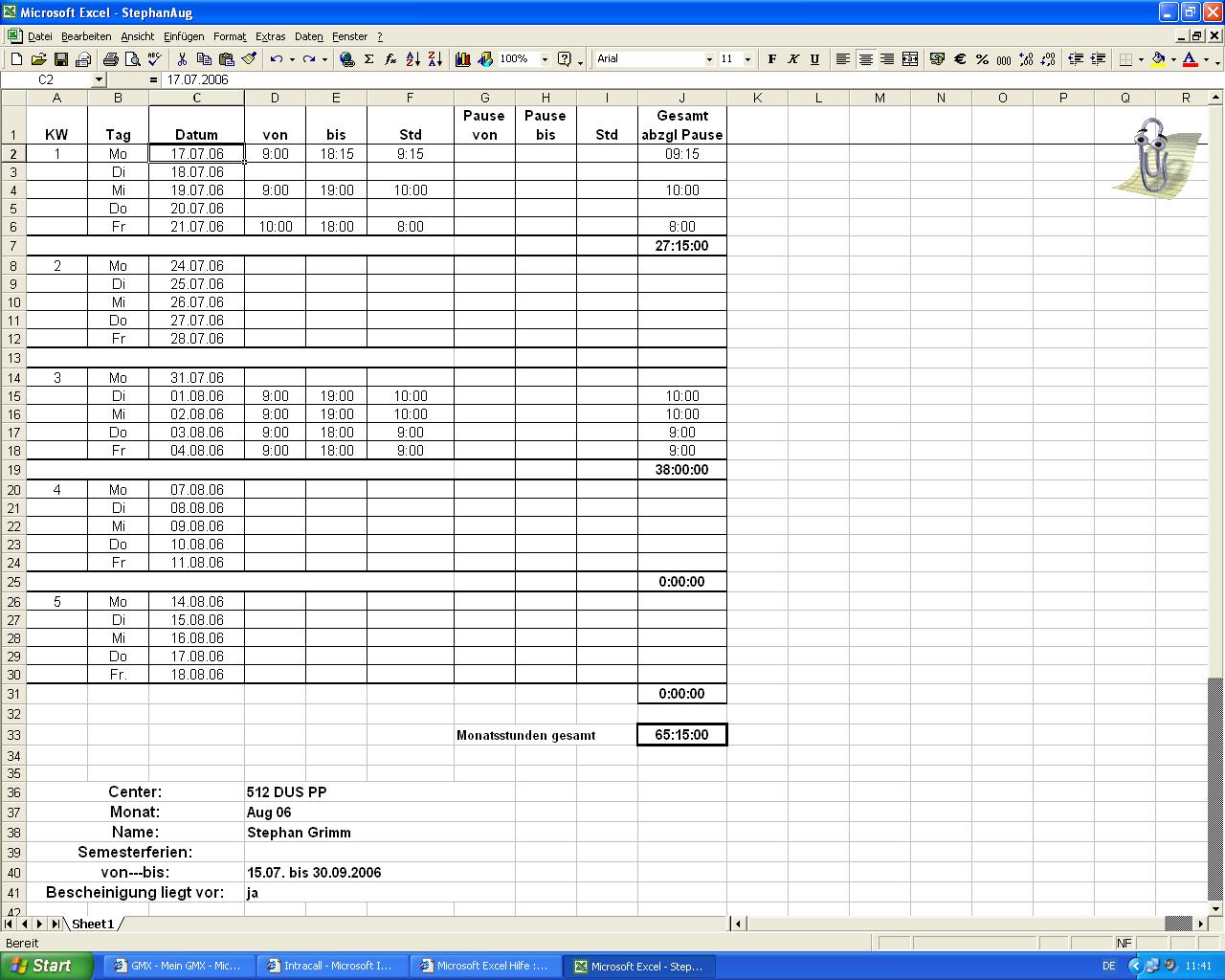 Helfe beim Thema Klassischer Studenplan... in Microsoft Excel Hilfe um das Problem gemeinsam zu lösen; Hallo, bin gerade am gestalten eines klassischen Stundenplans --> siehe screenshot. Weiss nicht wie ich die Zellen formatieren muss damit der mir in... Dieses Thema im Forum "Microsoft Excel Hilfe" wurde erstellt von Stephan Grimm, 16. August 2006.