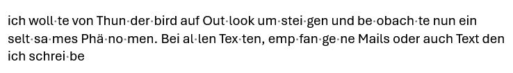 ich wollte von Thunderbird auf Outlook umsteigen und beobachte nun ein seltsames Phänomen. Bei allen Texten, empfangene Mails oder auch Text den ich schreibe sind sind regelmäßig kleine Punkte zu sehen, das erinnert mich irgendwie an Silbentrennung. Ein Bild kann ich leider nicht anhängen, das funktioniert nicht. Hat ihr eine Idee wodurch das verursacht wird und wie ich das abstellen kann? Das wird beim Senden nicht übertragen.