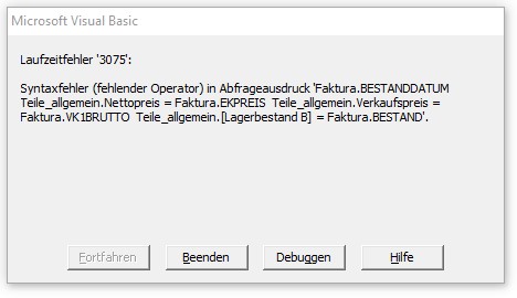 Helfe beim Thema Sql-Abfrage, Laufzeitfehler 3075, Syntaxfehler (fehlender Operator) in Microsoft Access Hilfe um das Problem gemeinsam zu lösen; Hallo an alle, ich habe folgendes Problem. In meiner Datenbank habe ich mehrere Tabellen, unter anderem die Tabelle Teile_allgemein und Faktura. Mit... Dieses Thema im Forum "Microsoft Access Hilfe" wurde erstellt von Tom_1125, 8. November 2025 um 01:52 Uhr.